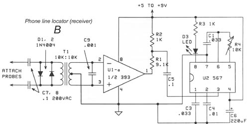U1-a constant amplitude output divided by ~10 to avoid overloading input of 567 tone decoder.