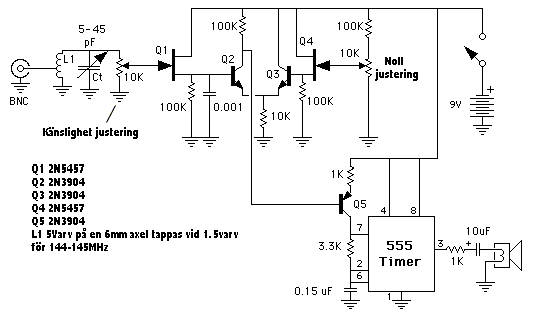 Den använder bland annat fem stycken transistorer och en timer krets 555 för att fungera.